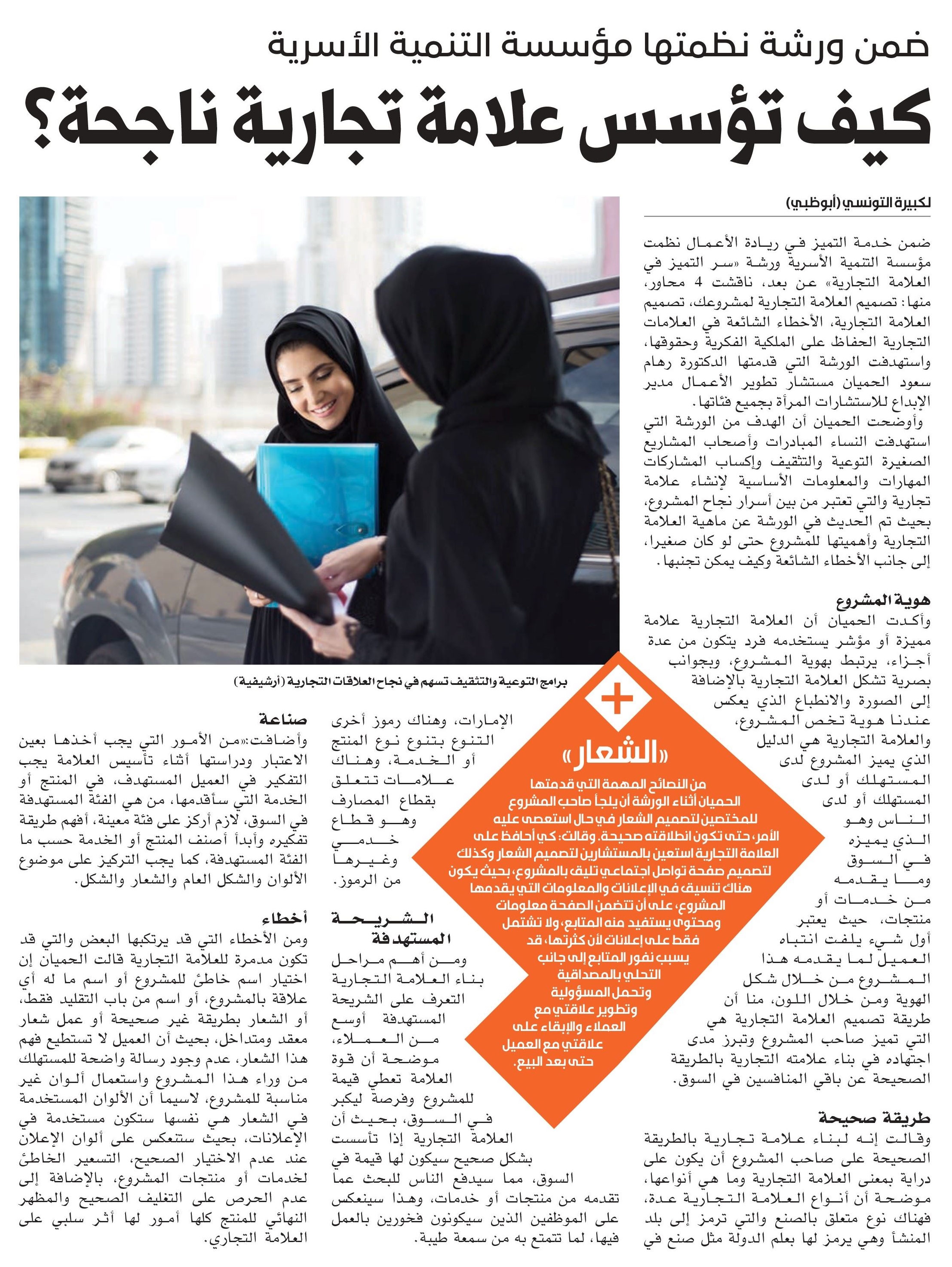 ضمن خدمة التميز في ريادة الأعمال نظمت مؤسسة التنمية الأسرية ورشة «سر التميز في العلامة التجارية» عن بعد، ناقشت 4 محاور، منها: تصميم العلامة التجارية لمشروعك، تصميم العلامة التجارية، الأخطاء الشائعة في العلامات التجارية الحفاظ على الملكية الفكرية وحقوقها، واستهدفت الورشة التي قدمتها الدكتورة رهام سعود الحميان مستشار تطوير الأعمال مدير الإبداع للاستشارات المرأة بجميع فئاتها.