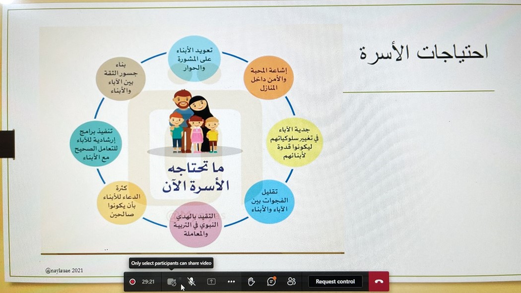 طرحت الشاعرة نايلة الأحبابي، في جلسة الافتراضية نظمتها أمس الأول «مؤسسة التنمية الأسرية» ضمن خدمات «مكتبة زايد الإنسانية»، محاور تربوية وثقافية عدة اعتبرتها ركائز بناء الأسرة، ومنها التفاهم في حديث الوالدين مع الطفل والإجابة البسيطة لأسئلته والاحترام المتبادل، إلى جانب توفير وقت للمتعة والمرح، وإيصال الحب للأطفال بالكلمة الواضحة والبسمة واللمسة اللطيفة. وأكدت في الجلسة التي حملت عنوان «الأسرة نواة المجتمع»، أهمية تشجيع الطفل عندما يقوم بعمل جيد، ما يؤهل الأسرة لتكون مثالاً يقتدى به في بناء المجتمع.